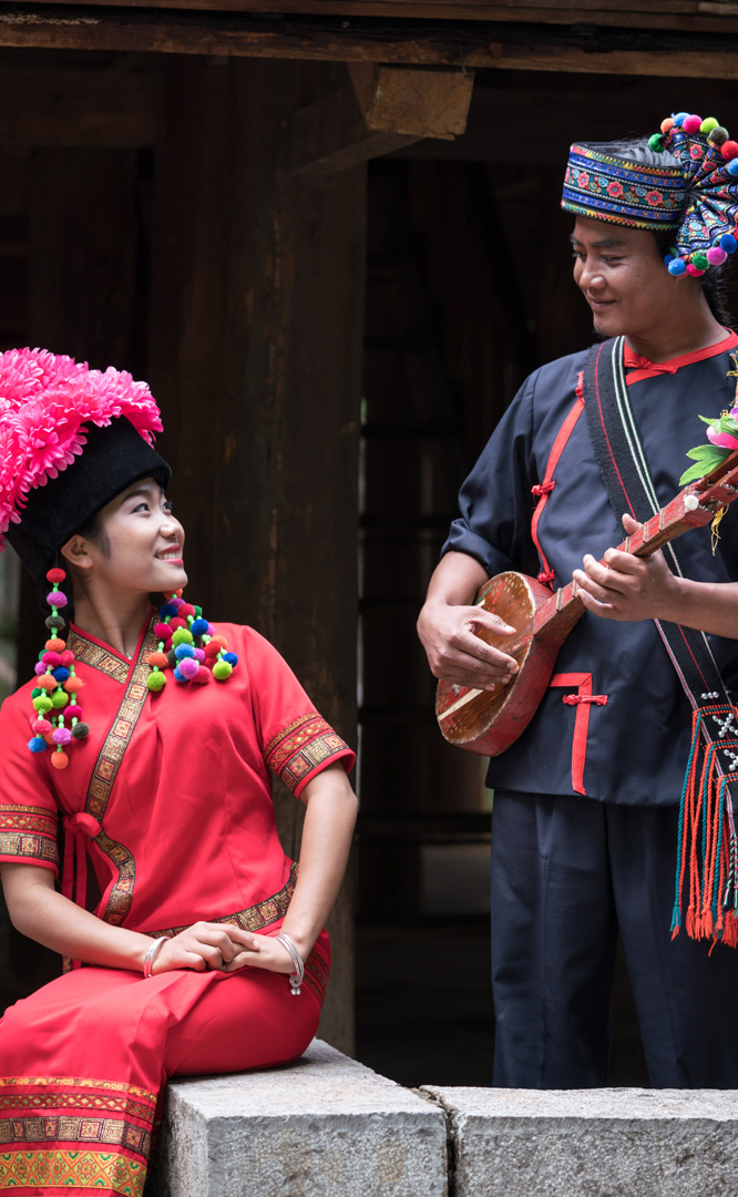 云南壯族主要聚居在文山州,人口114萬,民間的村寨大多依山傍水。壯族擅長種植水稻,有太陽崇拜和長老崇拜的風(fēng)俗,視銅鼓為重器,厚愛銀飾,善烹制五色花米飯,能歌善舞,熱情好客。進入景區(qū)壯族村,迎面有祭祀龍王的龍柱,兩邊是先民繪制的天王崖畫和為紀念傳說洪水泛濫時幫助先民度過劫難而建的石葫蘆亭。祭祀玉皇大帝的昊天閣和傳說能驅(qū)邪納福的碩大銅鼓聳立在廣場兩側(cè)。桿欄式和麻欄式民居、壯族青年社交休憩的“情廊”、村...