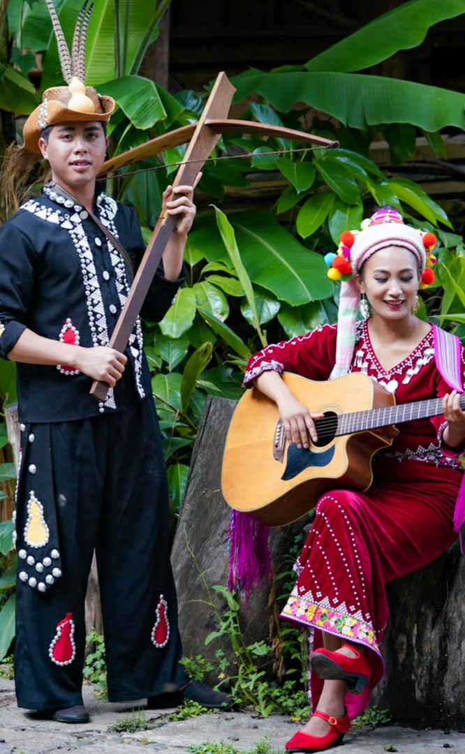 德昂族人口約1.7萬,主要分布在德宏州和保山市的潞西、梁河、瑞麗、隴川、隆陽等縣區(qū)。民居多為草排覆頂竹木結(jié)構(gòu)的干欄式建筑,眼前的德昂村建筑納入了能容納數(shù)十人居住的德昂大房子,氈帽頂?shù)男》孔樱€有頗具浪漫色彩的大公房、小公房……還建有“龍陽塔”標志及佛教奘房、佛塔。德昂族民間普遍信奉南傳佛教,民俗活動與佛事活動關(guān)聯(lián)緊密。潑水節(jié)、開門節(jié)、關(guān)門節(jié)是重大節(jié)日。德昂族服飾色彩豐富,口頭文學(xué)特別是民歌創(chuàng)作活動...